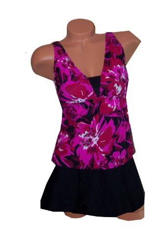 - Top: V-neckline with Solid Inset ~ All-over Brushstroke Floral Print in black/burgundy, Fuschia, Pink and White ~ Soft Padded Bra Cups Fit sizes C/B bra cups ~ Solid Skirted Bottom with Attached Brief Panty ~ Elastic Waist ~ 82% Nylon 18% Spandex ~ Hand Wash